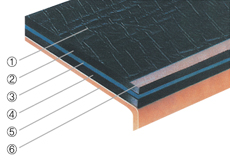 | 1. P·P无纺布 2. 改良沥青化合物 3. 中心增强材料 (P.P无纺布) 4. 改良沥青化合物 5. 异形胶片 6. 重叠异形胶片 |