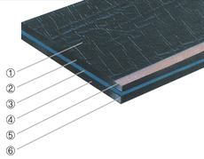 | 1. 聚乙烯薄膜 2. 改良沥青化合物 3. 中心加强材料(聚酯无纺布) 4. 改良沥青化合物 5. 异形保护膜 6. 重叠异形保护膜 |