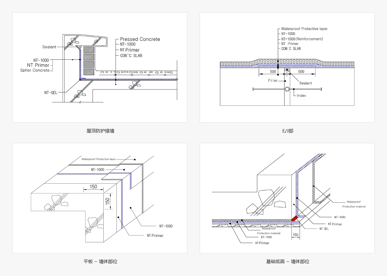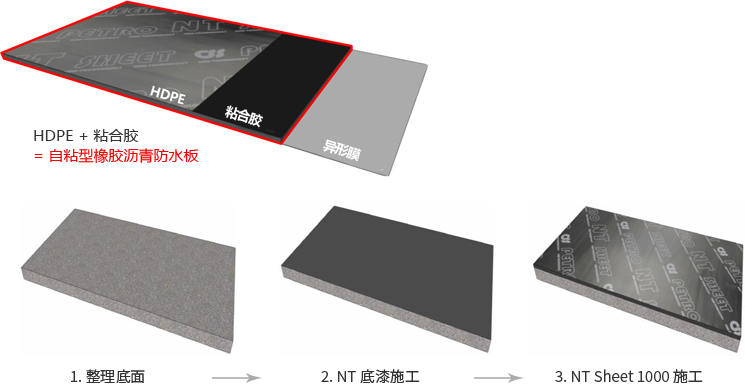 将具有抗张及伸缩,内凹进等物理性质,而且耐化学性,耐寒性和耐热性优秀的高密度聚乙烯保护膜(HDPE)和粘合性优秀的橡胶化沥青凝胶结合的防水板材料,是通过自粘式施工的防水工艺