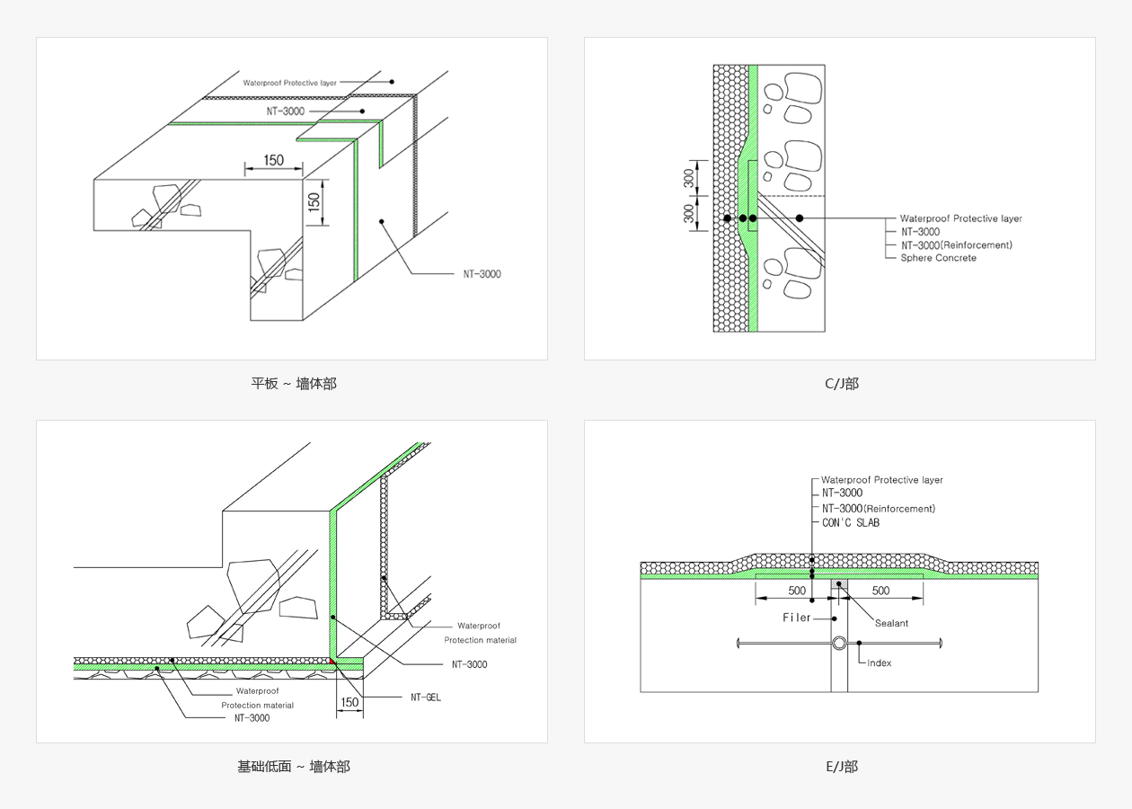 采用人工强度和耐热性,耐寒性优秀的改良沥青防水板材料和粘贴软型橡胶沥涂抹材料合成的高粘合型合成橡胶系复合板材料, 无需单独使用底漆和热气球即可进行施工的环保型复合防水工艺