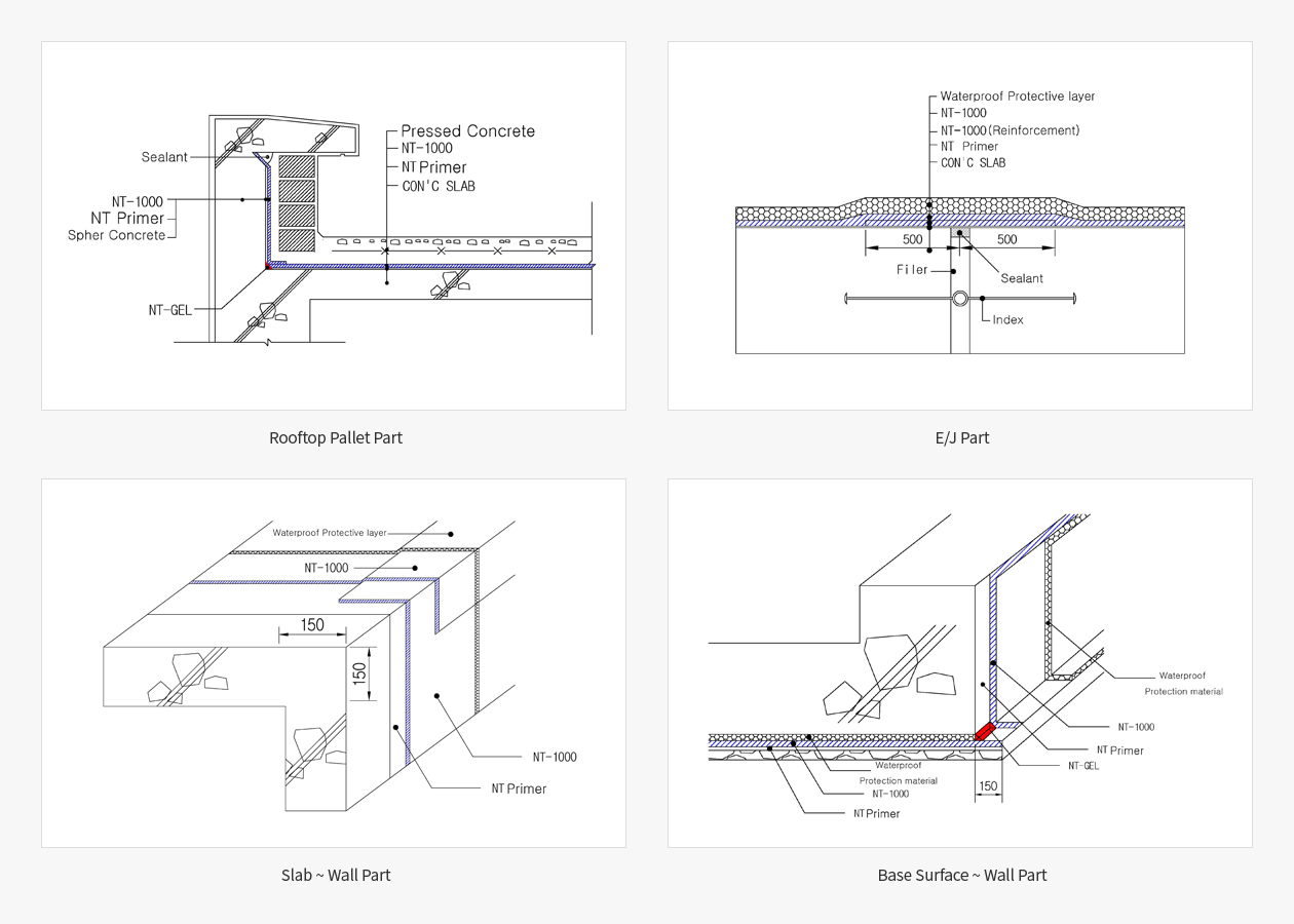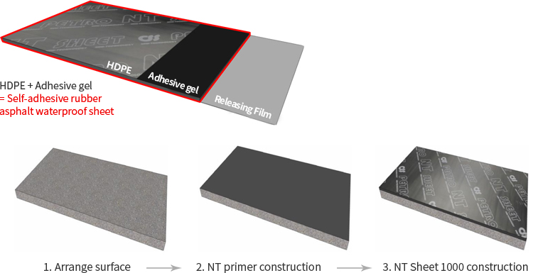 Not only the physical properties such as tension, elongation, and pitting but has excellent chemical resistance, cold resistance, and heat resistance. It uses the cold air method for the waterproofing method to combine excellent rubber asphalt gel with polyethylene film (HDPE).
