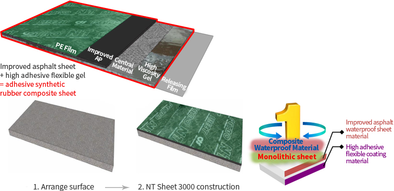 Environmentally friendly waterproofing method for construction without use of separate primers and heat appliances with high-point synthetic rubber composite sheet that combines advanced asphalt waterproof sheet materials with adhesive flexible rubber asphalt coating materials with high tensile strength, heat resistance, etc.