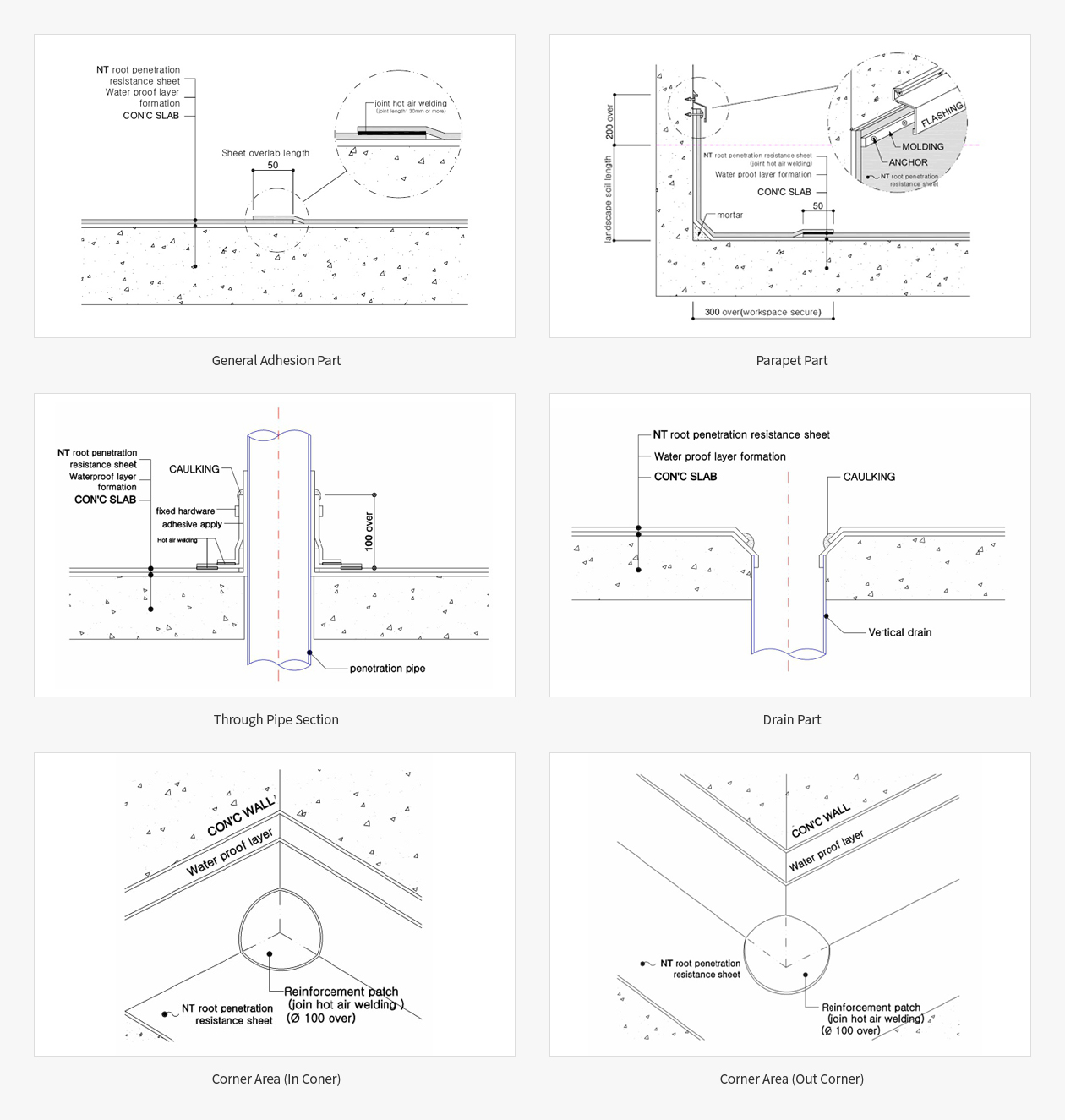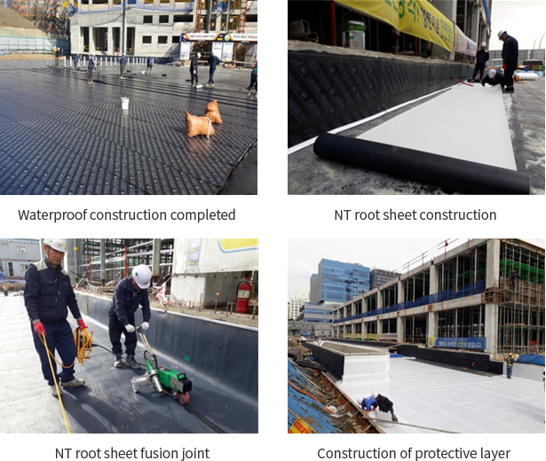 NT Root Barrier Method applied regenerative TPO for the purpose of ensuring eco - friendly by utilizing cyclical resources. It was manufactured by polymerization reaction using metallocene catalyst, not by simple mixing, and applied a regenerated Reactor TPO for excellent materiality. It also maintains most of its original performance after regeneration, and applied a physical performance.