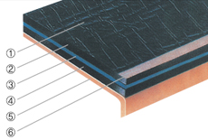 | 1. P·P부직포 2. 개량아스팔트콤파운드 3. 중심보강재 (P.P직포) 4. 개량아스팔트콤파운드 5. 이형필름 6. 오바랩이형필름 |