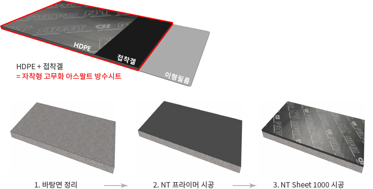 인장 및 신율, 내움푹패임과 같은 물리적 성질 뿐만 아니라 내화학성, 내한성, 내열성 등이 우수한 고밀도 폴리에틸렌 필름(HDPE)과 접착성이 우수한 고무화 아스팔트 겔을 합지 시킨 방수시트재로 자착식으로 시공되는 냉공법형 방수공법